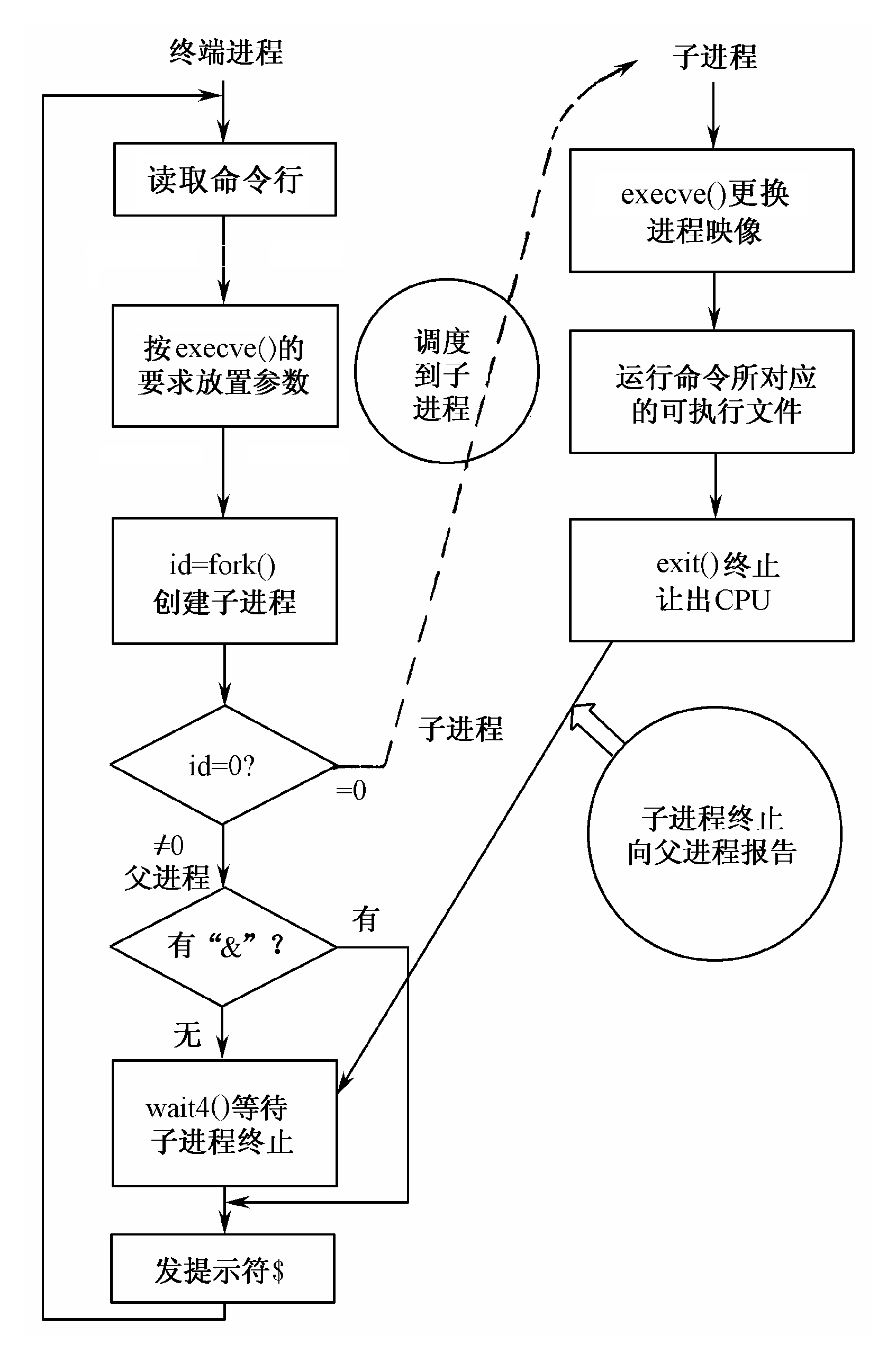 - 外置方式:每条外置命令都对应专门的系统程序,通常以可执行文件的形式存放在磁盘上